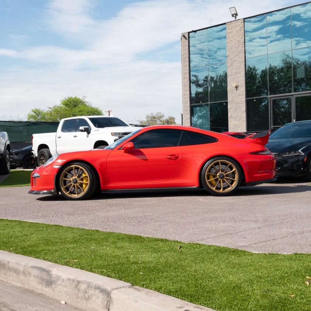 A high-performance sports car with a 3.8-liter 6-cylinder engine. This GT3 model is designed for a track-focused driving experience, featuring the Sport Chrono Package and Electromechanical Steering. It also offers luxury amenities like heated leather seats, a premium sound system, and a navigation system